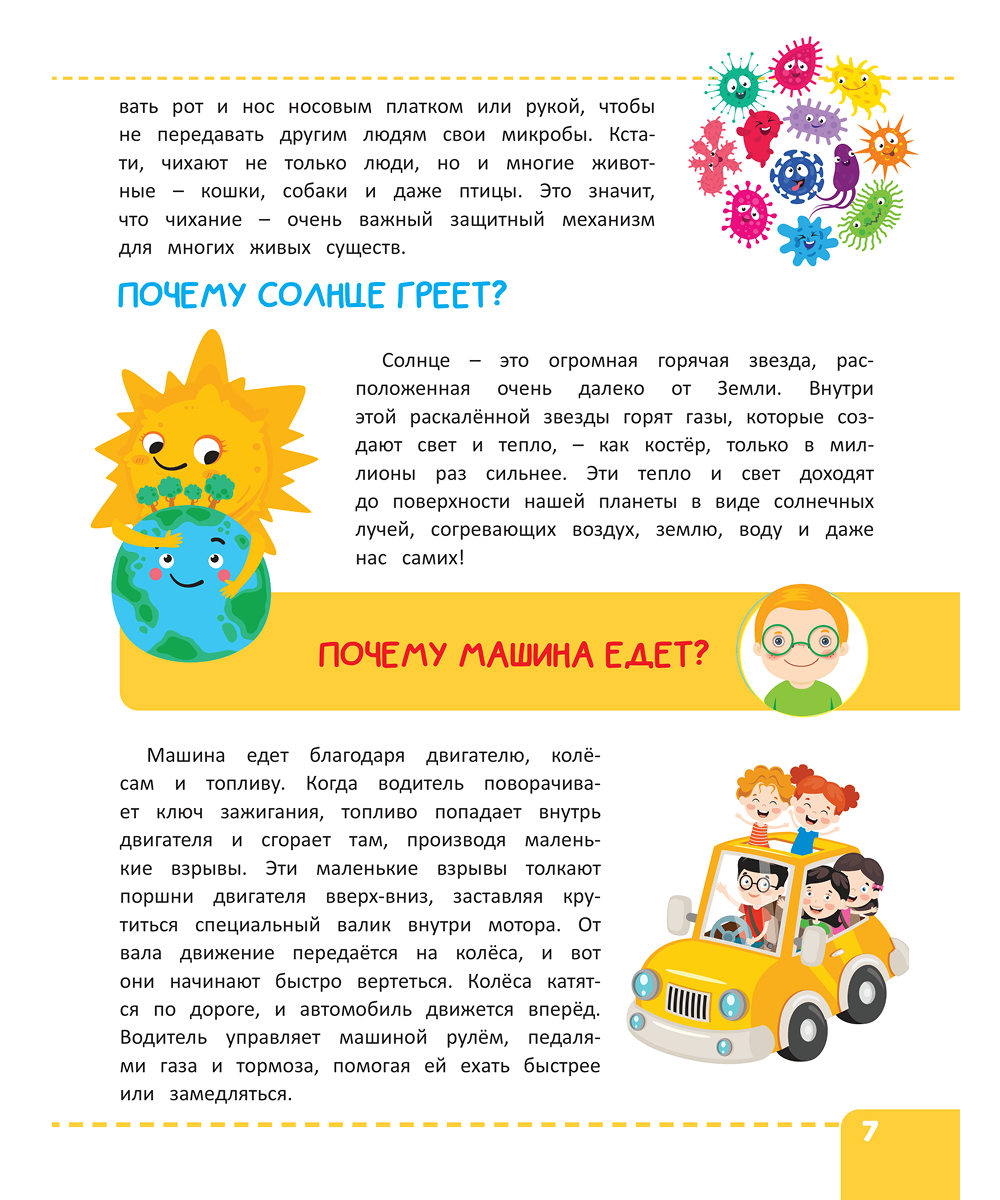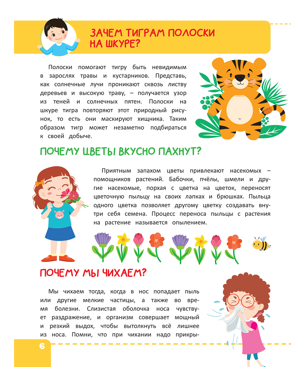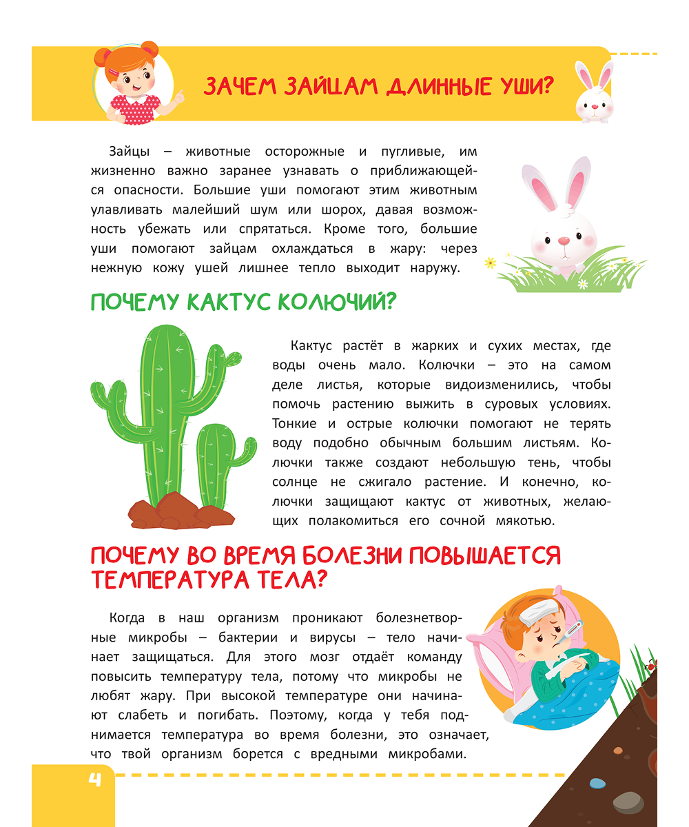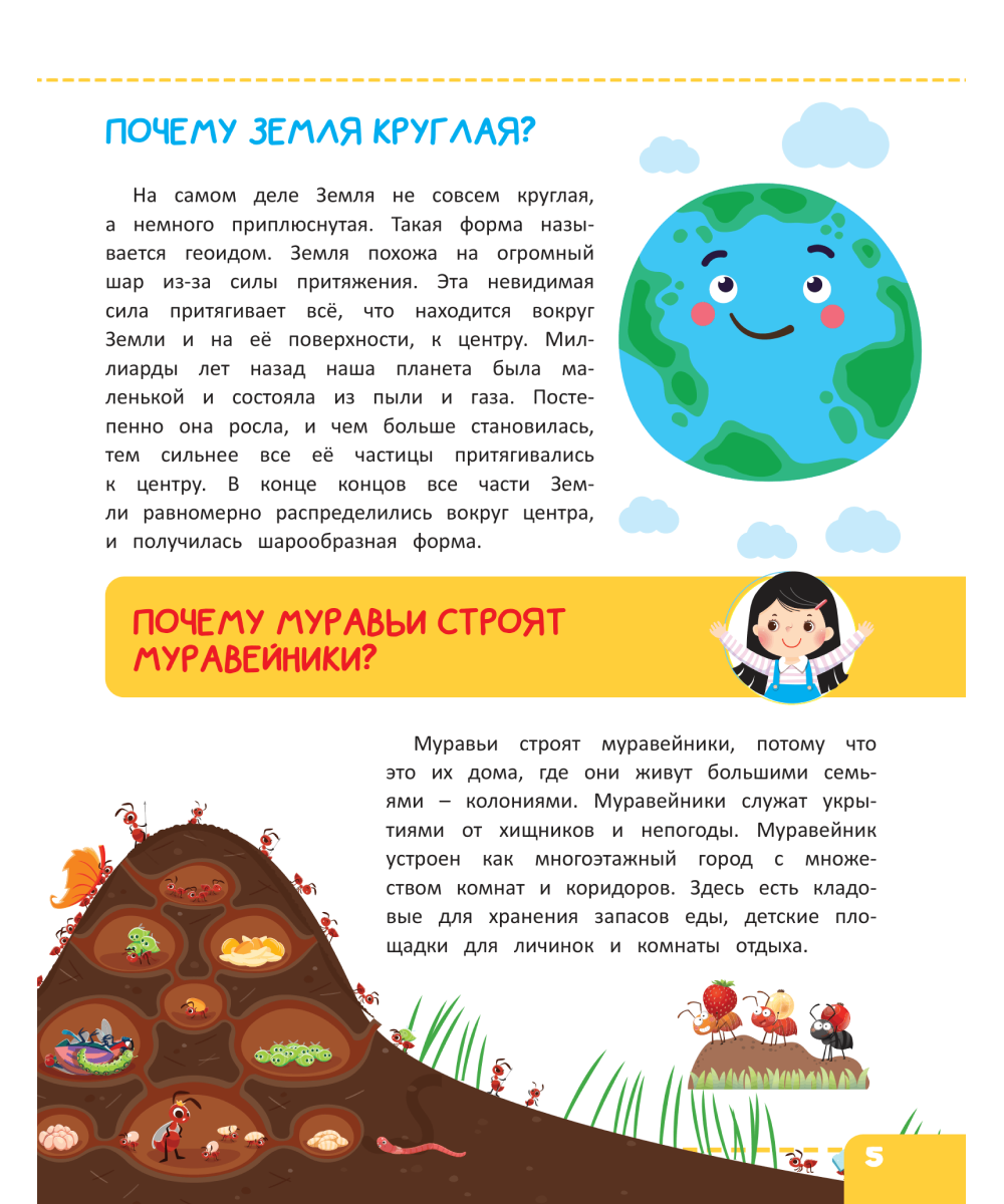 • Большая книга «Почему» охватывает 5 главных тем: животные и растения, тело человека, планета Земля и космос, природные явления, транспорт и техника.